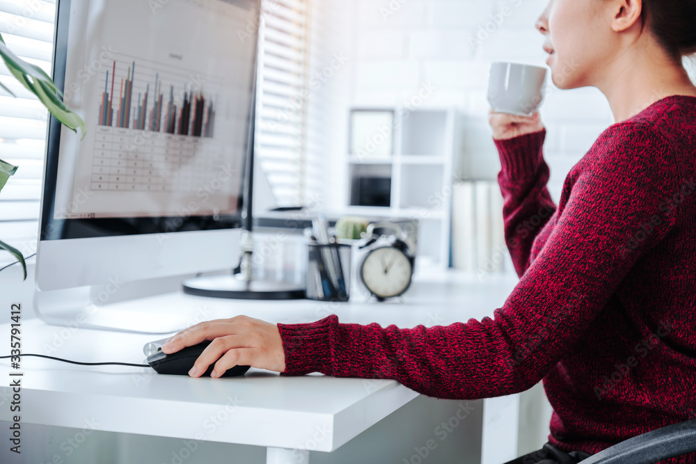 Asian woman working from home using computer and drinking coffee in her bedroom document finance and conference online meeting for new projects