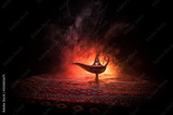 Lamp of wishes concept. Antique Aladdin arabian nights genie style oil lamp with soft light white smoke, Dark background.