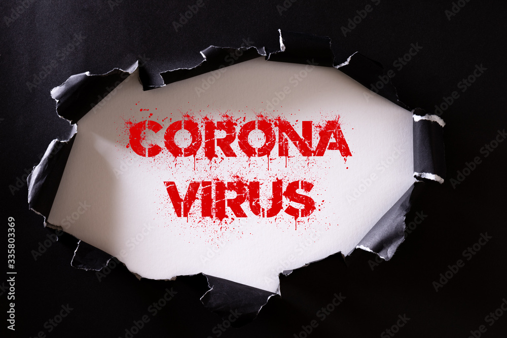 Top view of Black torn paper and the red text Coronavirus on a white background. Healthcare and medical concept.
