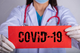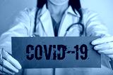 Female doctor wearing surgical mask, stethoscope and holding red torn paper with COVID-19 text. Healthcare and medical concept.