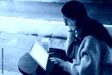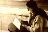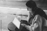 Woman sitting with ultrabook on street