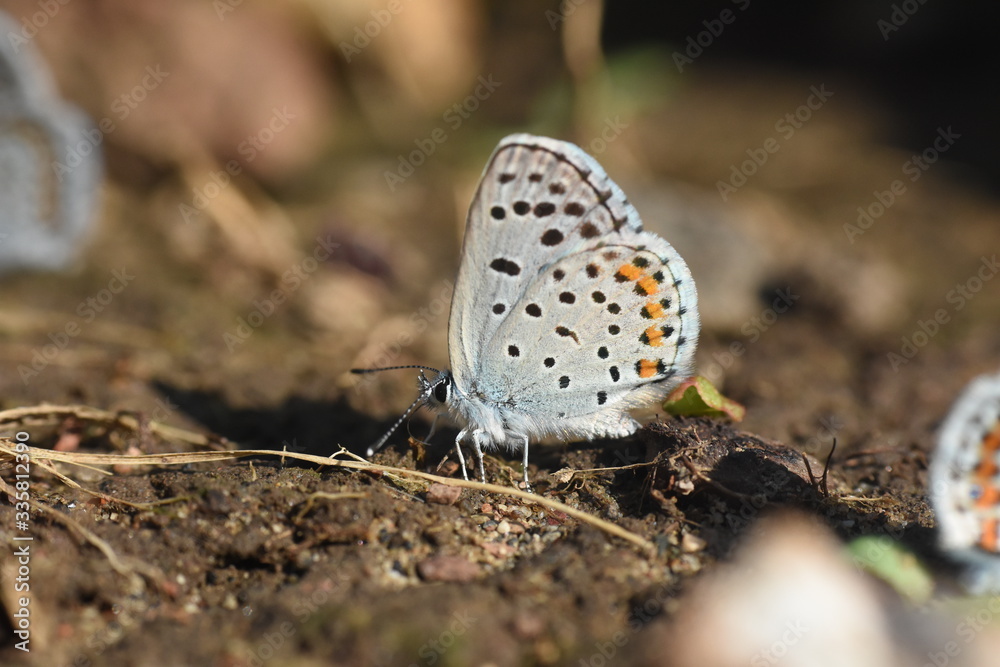 Himalayan Blue Butterfly, Pseudophilotes vicrama. Rare little blue butterfly on ground