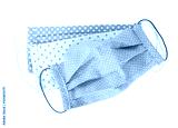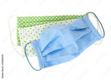 Handmade multicolored fabric reusable protective medical masks isolated on white background.