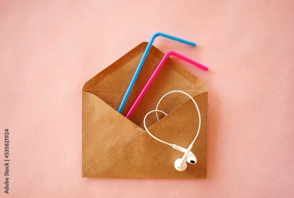 A brown envelope with the earphones in the shape of a heart and two sticks for drinks in it