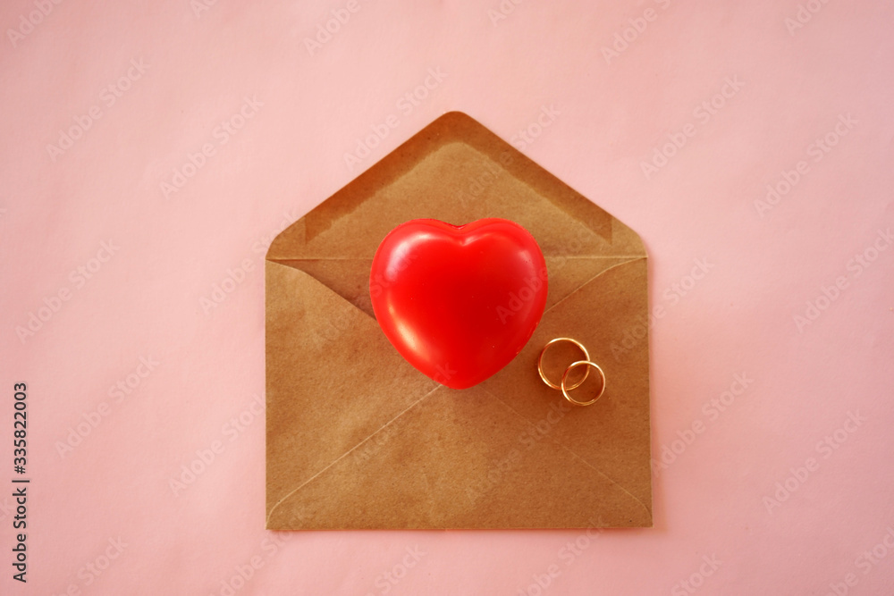 A red heart with two wedding rings lie on a brown open envelope on a pink background
