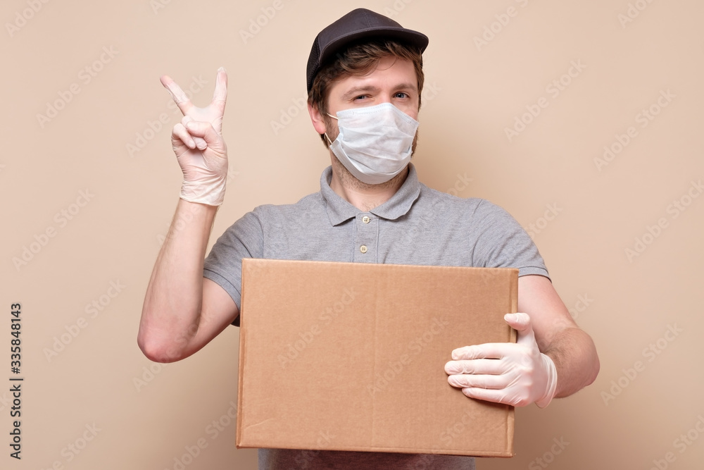 delivery man in medical mask showing victory or peace gesture holding cardbox