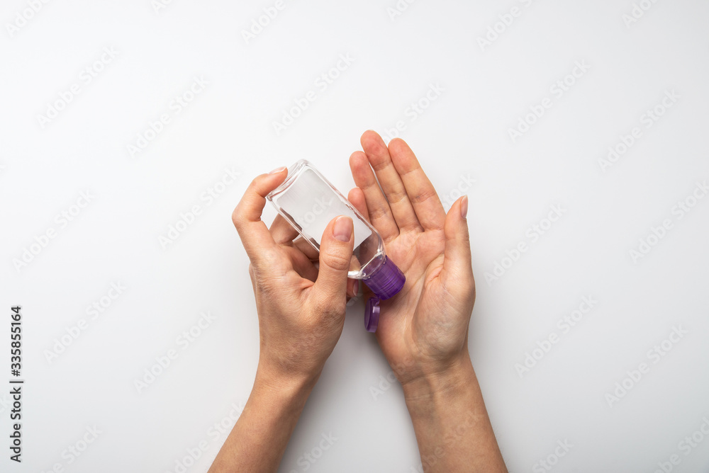 Health care hygiene protection prevention against virus, bacteria, flu and coronavirus, covid -19 by using antiseptic alcohol gel. White background