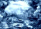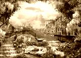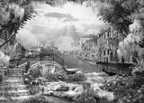 Beautiful collage with access to the sea, the ancient houses of Venice, flowers and waterfalls. Digital collage , mural and fresco. Wallpaper. Poster design. Modular panno.