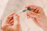 Closeup of doctor looking at electronic thermometer with healthy normal 36.6 temperature. Man patient holding digital thermometer in hands. Coronavirus COVID-19 diagnosis. Body temperature measurement