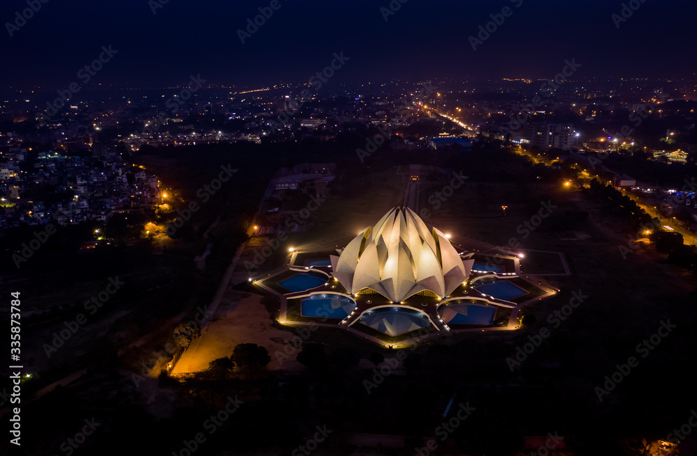 Delhi lotus building at night, India, aerial drone view