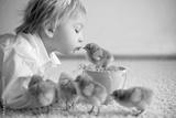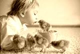 Cute sweet little blond child, toddler boy, playing with little chicks at home, baby chicks in child