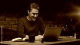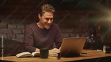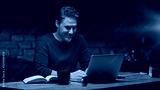 Older man tele working with laptop computer at home office in dark room, thinking, looking busy.