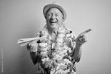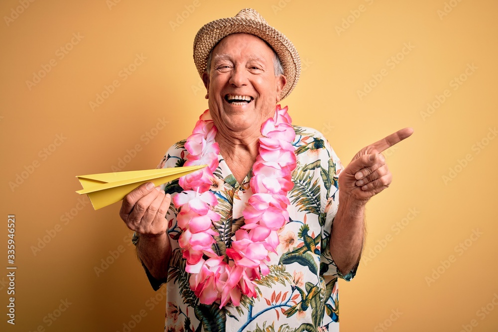 Grey haired senior man wearing summer hat and hawaiian lei holding paper plane on vacation very happy pointing with hand and finger to the side
