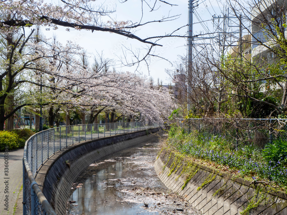 用水路沿いの満開のソメイヨシノの桜並木