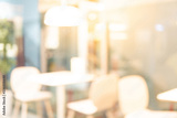 Abstract blurred restaurant background. Blurry cafe or coffee shop with dining tables, chairs and other decorations. Blur backdrop for design element. Food and beverage concept.
