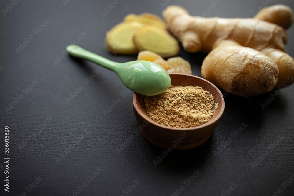 Ginger root, spices on a black background. The concept of healthy nutrition, protection from viruses, increased immunity during coronavirus quarantine, super nutrition. Selective focus.