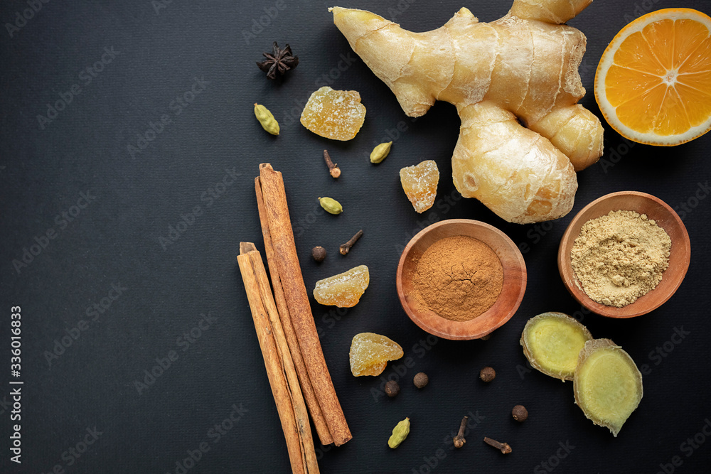 Ginger root, cinnamon, spices and lemon on a black background. Healthy food concept, virus protection, increased immunity during coronavirus quarantine, super nutrition