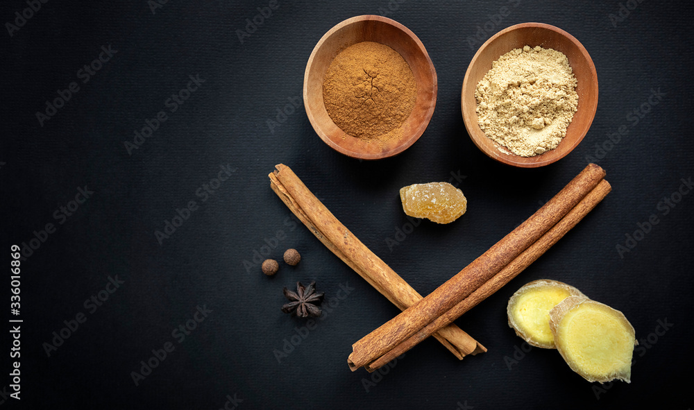Composition of cinnamon and ginger on a black background. The concept of healthy nutrition, protection from viruses at home, increased immunity during coronavirus quarantine, super nutrition.