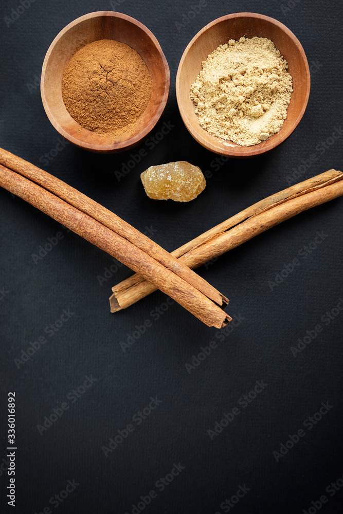 Composition of cinnamon and ground ginger on a black background. The concept of healthy nutrition, protection from viruses at home, increased immunity during coronavirus quarantine, super nutrition.
