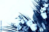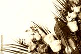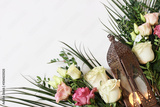 Vintage bronze Moroccan, Arabic lantern with glowing candle, green branches, pink rose flowers and palm leaves on white table background. Greeting card for Muslim holiday Ramadan Kareem.