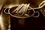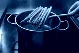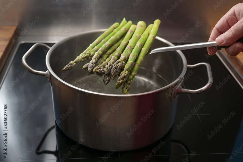 Hand puts green asparagus on a skimmer in a pot with boiling water for a holiday dinner, healthy cooking concept, copy space