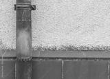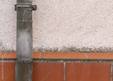 Rura kanalizacyjna. Sciana Domu. Elewacja budynku. Czerwone cegly. Rura spustowa. Polaczenie rynny. Rura odprowadzajaca wode deszszowa.