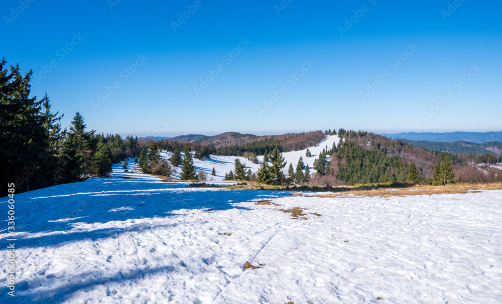 Meadows at the end of winter with snow and mountains in the background, beskydy czech