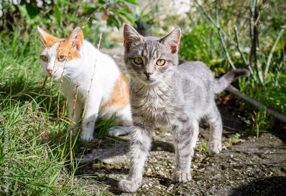 Mediterranean cats, cute animals and pets, incredible face expression. Candid photos in their environment, outdoors.