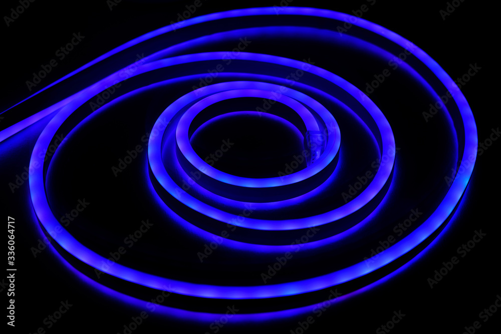 Blue LED light diode stripe cable roll on black background. Modern lightning