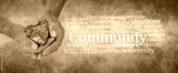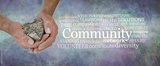 Care for your Community Word Cloud - male hands holding a wooden rustic heart with the word CARE beside a COMMUNITY word cloud against a rustic stone effect blue grey background