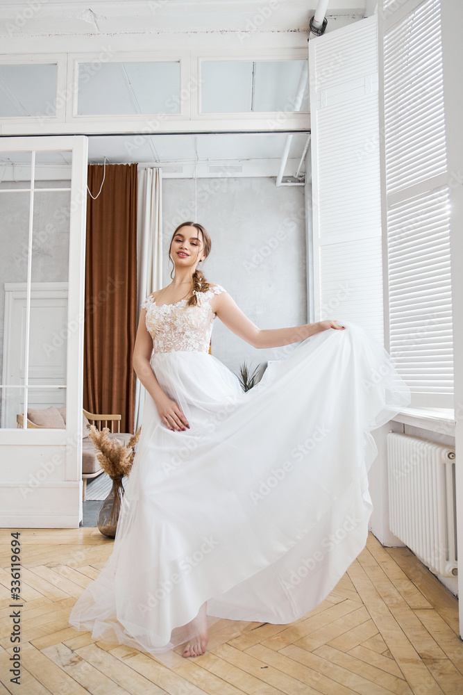 Bride is a woman in a light summer wedding dress standing at the window. Brown-haired girl with perfect hair and beautiful makeup