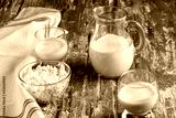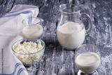 Fermented drink kefir in a glass and curd cheese in glass bowl.