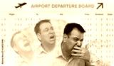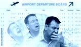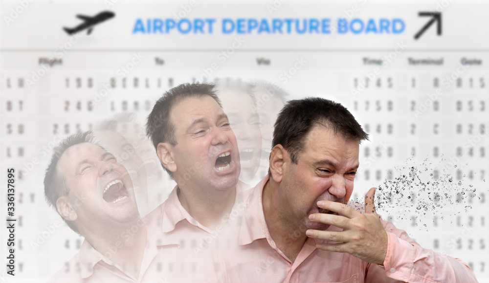 A man is coughs to his hand, on a background a board of departing aircrafts. A sick passenger sneezes bacilli and viruses around himself.