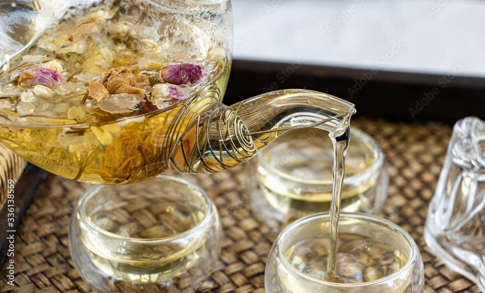 Herbal tea of drying flowers is pouring to cup, close up. A teapot and cup with flowers tea on table.