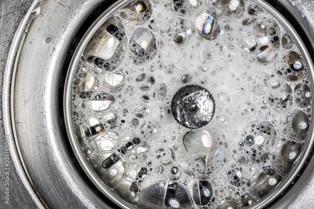 White foam with bubbles of cleaner in a washbasin, macro view. Drain hole with soap bubbles in metal sink. Mechanically adjustable drain plug closeup.