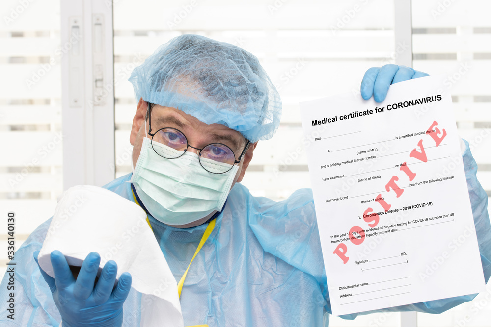 Doctor in protective suit holding positive medical certificate at coronavirus and offers toilet paper. The Laboratory examination of blood with a positive result for the disease corona virus.