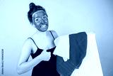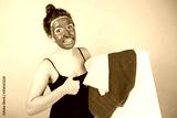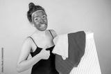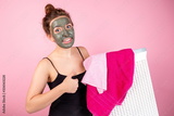 Girl housewife with clay mask on her face holding a basket with dirty things shows class with hand