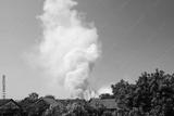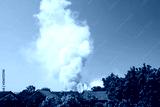 fire and white smoke overview in city blowing on blue sky. emergency danger air pollution in summer season.