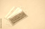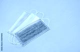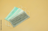 three charcoal green and white paper mask surgical filter dust pollution and disease corona virus. safety medical equipment. Isolated on yellow background.