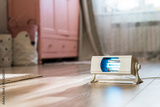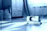 A working ultraviolet lamp in the background of a children's room. Protecting and cleaning rooms from bacteria and viruses in the context of the coronavirus pandemic. Child health care