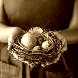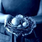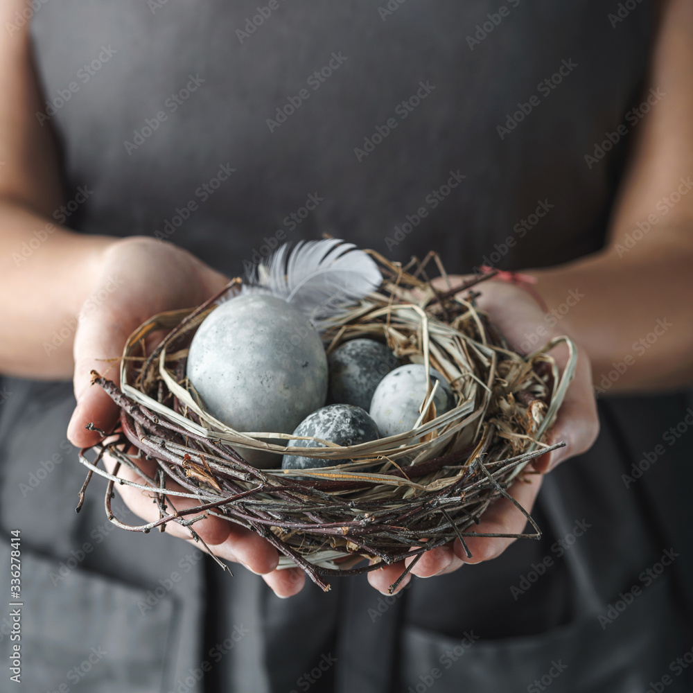 Woman hands holding nest with marble Easter eggs with feathers on dark background. Happy Easter holiday, selective focus, toning