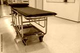 An emergency stretcher without patient at hospital corridor. Stretchers are primarily used in hospital care situations for moving patients who require medical care.