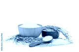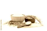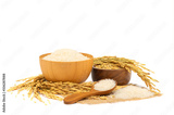 White Jasmine rice in a wooden bowl and wooden spoon and paddy rice and with Ear of rice isolated on white background