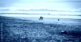 Couple with dogs walking on the beach during colorful sunset, shot at New Brighton Beach, Christchurch, New Zealand.