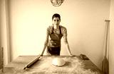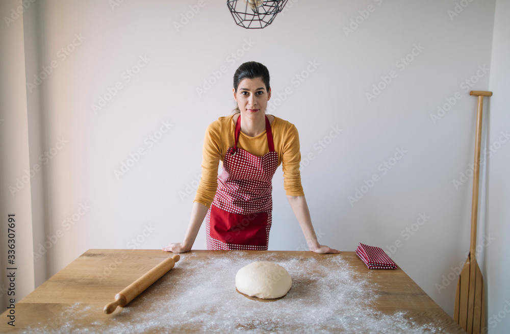 Young woman wearing apron prepearing dough on kitchen table. Baking homemade bread