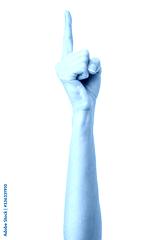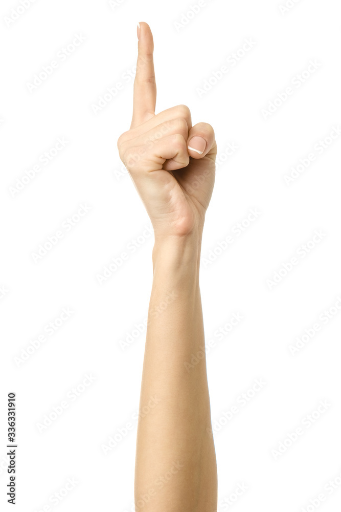 Pointing up. Woman hand gesturing isolated on white