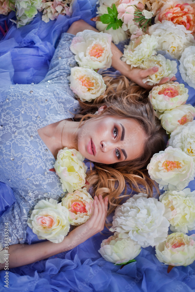 beautiful girl in a blue dress on a bed with flowers