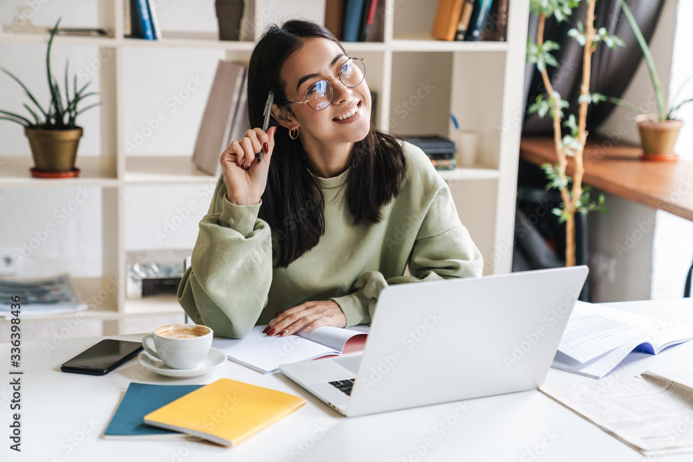 Optimistic young girl student using laptop computer