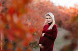 Beautiful pregnant girl blonde on nature in the yellow and red leaves of autumn