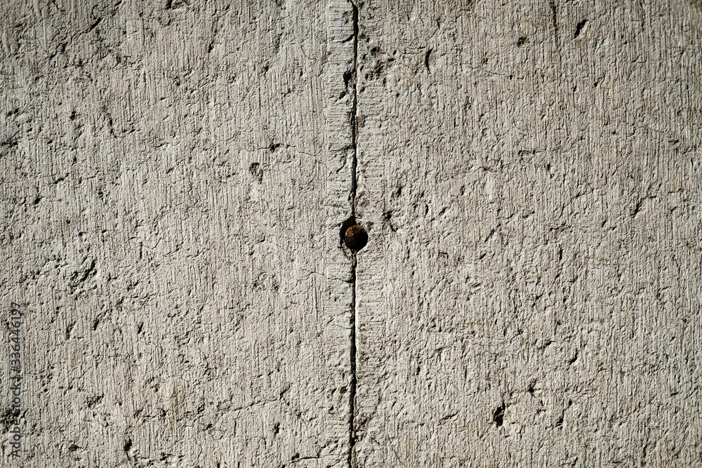 Abstract, grunge, old cement stone wall texture background. Rough weathered wall blocks with nail. Close up, copy space